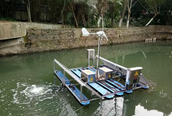 由环湖路进入湖滨饭店的小路上有一座小桥,站在桥边能清楚地看到这条河浜与蠡湖相连的一头被闸坝截断了,是条断头浜。而在桥的另一侧,河面上有一座形似“小型风力发电站”的装置,装置上的风车呼啦啦地转着,而水面上不断有“气泡”从该装置流出来。项目组专家告诉记者,这台太阳能曝气装置是用来给河水曝气增氧的。记者注意到,由于天空阴沉加之两岸树荫影响河水水色较深,但从视觉感官上看还是比较干净的,透明度较高。