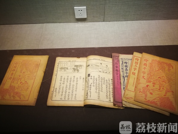 此次展出的文物题材涵盖服饰、生活用品、织绣等,反映了清末民初江南女性的一些生存状况。各种刺绣织物摆放在橱柜中,不论是衣服、围嘴还是镜套、荷包、绒花等,花纹复杂色泽明艳。荔枝网友在现场看到,三款外形酷似长方形的织布较为亮眼,据悉,这是清末知识女性的名片布袋,上面配以文字和图案,新颖别致,颇有一番讲究,展现了江南女性对美好生活的期盼。