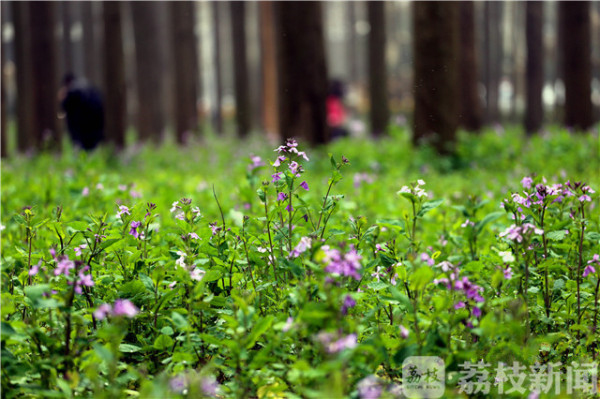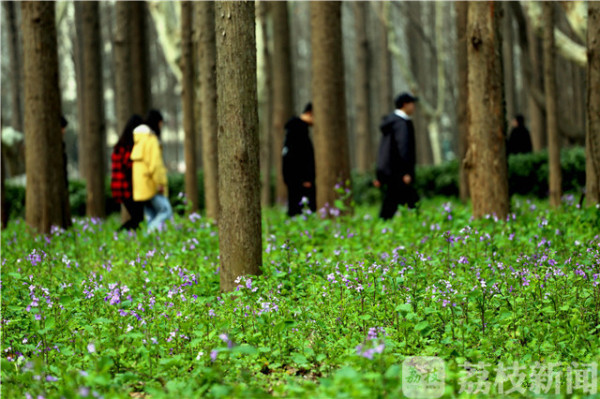 南京理工大学学生周海娟和同学徜徉在紫色花海中,她说:“特别美,有很多人都来这里踏春,春的气息很浓郁。”