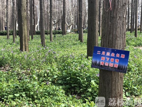 南理工在水杉林种植二月兰已达16年之久,面积有10余亩,已经成为学校的“文化名片”。再过十几天即将进入二月兰的最佳观赏期,届时将涌入更多的游人。赏花易忘我,免不了误踩二月兰。由于二月兰的花茎很脆弱,一碰就断。往年,一些情侣把拍婚纱照的地点选在了这里,可是所到之处却让花海伤痕累累。在此,南京理工大学向大家发出了“美景需呵护,赏花当文明”的倡议。