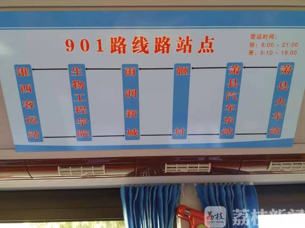徐萧城际公交是徐州开行的首条跨省毗邻公交线路,线路番号--城际公交901路。线路全长约25公里,配车18辆新能源公交车,开通初期全程共设置六个停靠站点。线路起讫点分别为徐州市淮西客运站、萧县火车站,线路途经三环西路、311国道,沿途停靠(徐州境内)生物工程学院、雨润新城、(萧县境内)姬村、萧县汽车东站。线路票价实行全程一票制五元,实行无人售票。线路起点淮西客运站可实现与徐州公交1路、4路、15路、31路、35路、59路、66路、67路、70路、99路等多条公交线路和即将开通的徐州轨道交通一号线韩山站实现无缝换乘。线路起点淮西客运站发车时间从早晨6点至晚上21点,线路讫点萧县火车站发车时间从早晨5点10分至晚上19点,高峰时段发车间隔10分钟,平峰时段发车间隔25分钟。两地居民可使用徐州市民卡、微信、投币等多种方式进行付费乘车。