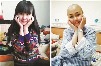 ▲因为化疗、吃药,孙莹体重增加到140斤,舍弃了一头长发,在学校就戴假发