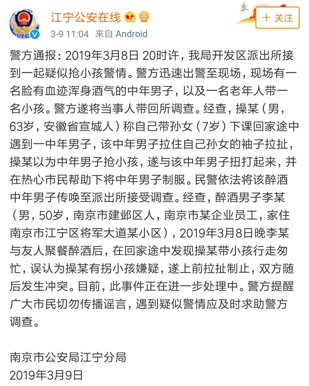 荔枝新闻讯 3月9日上午11:04,@江宁公安在线 就南京市江宁区疑似发生“抢小孩”事件进行通报:2019年3月8日晚,醉酒男子李某(男,50岁,南京市建邺区人,南京市某企业员工,家住南京市江宁区将军大道某小区)在回家途中发现操某(男,63岁,安徽省宣城人)带小孩(7岁,操某孙女)行走匆忙,误认为操某有拐小孩嫌疑,遂上前拉扯制止,双方随后发生冲突。目前,此事件正在进一步处理中。