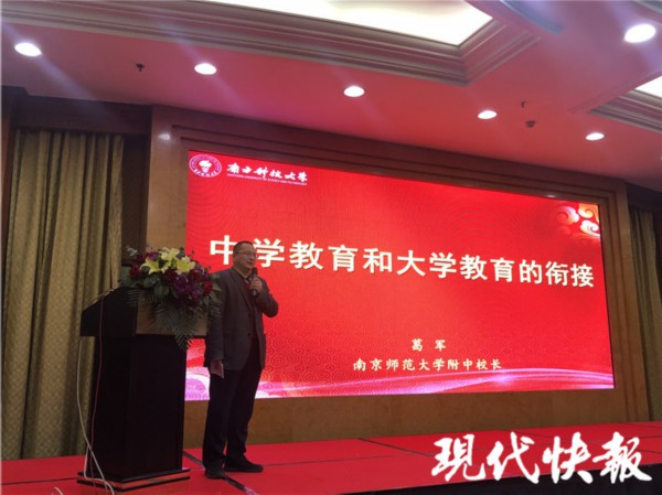 被称为 " 数学帝 " 的南京师范大学附属中学校长葛军,也来到现场,做了 " 中学教育和大学教育的衔接 " 主题报告。葛军说,南科大是培养能为国家做出巨大贡献的人才的高等级培养基地。他建议考生,适合的选择才是应该的选择,要摆正心态,不要以分数为唯一标准。他表示,不要因为高分就一定要扎堆进入哪所学校,重要的是选择自己感兴趣的、一流卓越的专业。他表示,很认同高校综合评价选拔人才的模式,希望一直要坚持下去,而且要放大。" 要未来成为最为优秀的人才,必须有宽厚的基础、灵活的思维,强烈的兴趣,有自觉思考探究的习惯。" 他认为,一张卷子面对所有人是考不出来的。