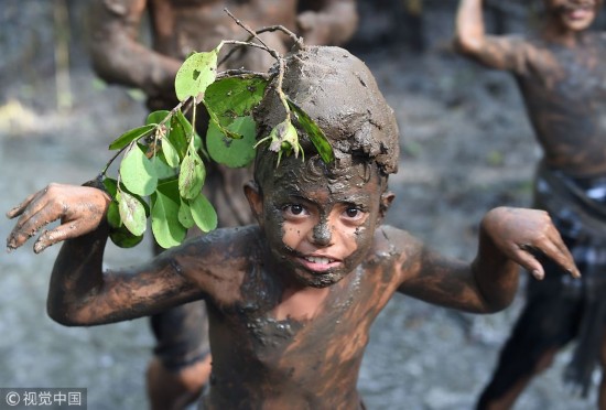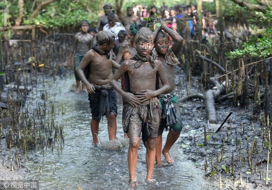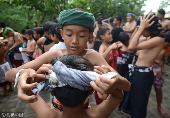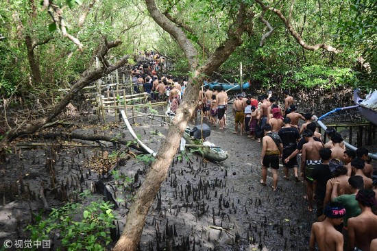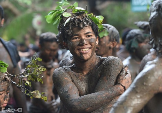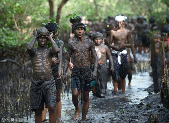 当地时间2019年3月8日,印尼巴厘岛登巴萨Kedonganan村,民众参加传统的泥浆浴。该活动在静居日之后一天举行。
