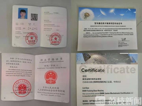 南京金陵高等职业技术学校汽车技术系副主任褚新浩介绍:“学生毕业时,拿到学校的毕业证书,代表他的学历;汽车维修工的中级和高级证书,代表他实际的操作能力;还有汽车公司BEST项目的结业证书,代表他参加了整个的培训过程;最后一个也是比较难的是等级证书,包括机电、钣金、喷漆、服务顾问各种岗位的认证。”