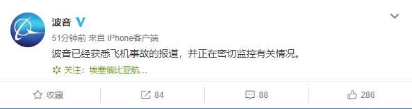 波音公司也通过官方微博第一时间回应此事,称波音公司已经获悉飞机事故的报道,并正在密切监控有关情况。