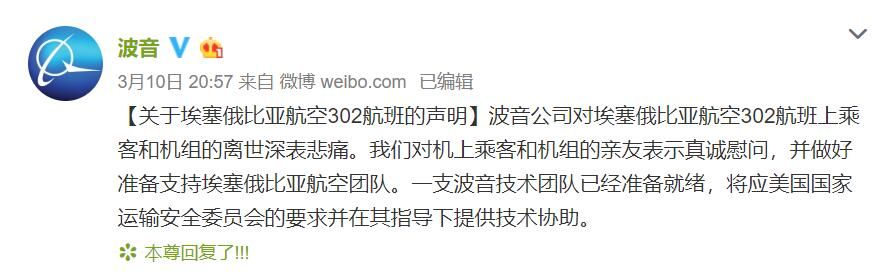 随后波音公司发布了一则声明,对埃塞俄比亚航空302航班上乘客和机组的离世深表悲痛。我们对机上乘客和机组的亲友表示真诚慰问,并做好准备支持埃塞俄比亚航空团队。一支波音技术团队已经准备就绪,将应美国国家运输安全委员会的要求并在其指导下提供技术协助。
