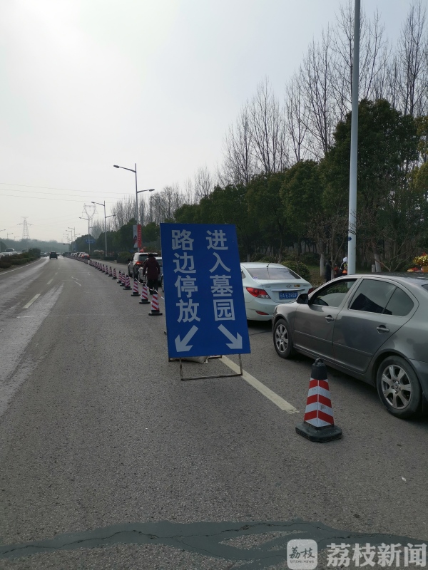 执勤交警告诉记者,由于今天天气转好,从早上八点开始,祭扫人流激增,已经出现了首个祭扫高峰,为此交管部门特地在宁丹路上对车流进行了分离。“昨天的人流和车流不是很多,今天明显要多很多。我们采取分道行驶,进入墓园的车辆和停放在路边的车辆是分道行驶的,避免了压队。”南京交警八大队中队长陈旭升说,公墓附近的宁丹路两侧均可以临时停车,但不可以乱停乱放。到了下周,市民到南郊扫墓尽量避开安德门大街和宁丹路。