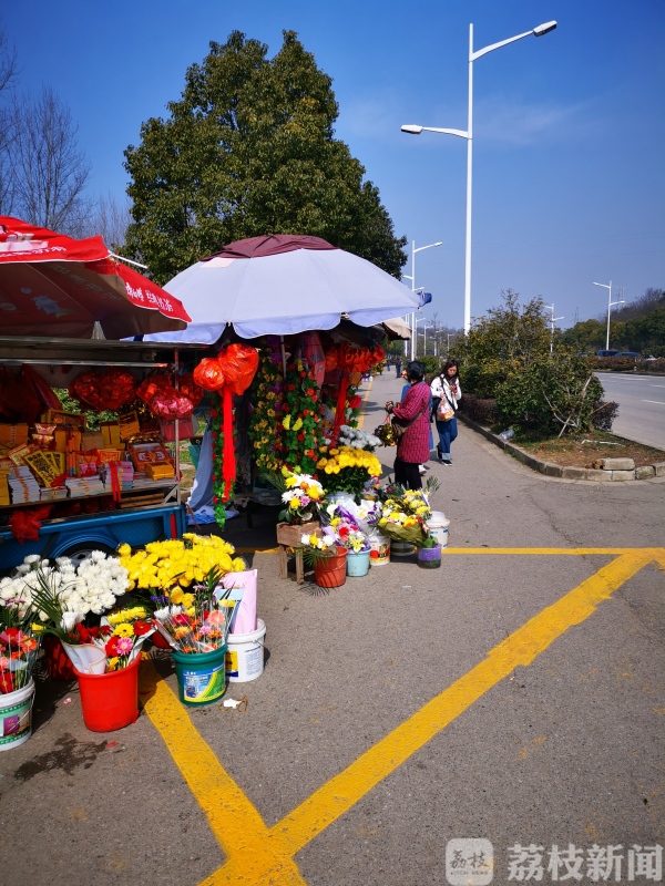记者发现,对于路边售卖鲜花的商贩,铁心桥街道高家库社区也组织人员在现场进行巡查管理,往年出现的售卖鲜花商贩穿梭在扫墓车流中的情况已经基本杜绝。“我们的城管队员在早上六点钟就上岗,把道路两侧占道经营的商贩规劝到指定地点,然后来回巡逻,不允许出现到机动车道上售卖的情况。今天社区加城管科一共出动了40人。”南京铁心桥街道高家库社区工作人员说。