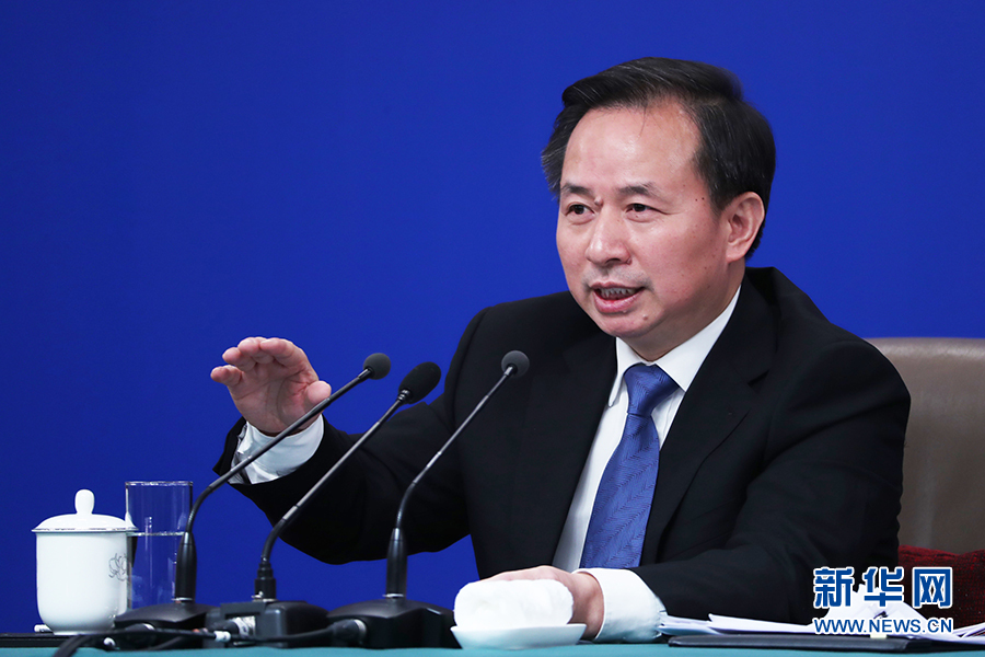 十三届全国人大二次会议新闻中心于3月11日(星期一)15时在梅地亚中心新闻发布厅举行记者会,邀请生态环境部部长李干杰就“打好污染防治攻坚战”相关问题回答中外记者提问。图为李干杰回答记者提问。新华网/中国政府网 刘厦 摄