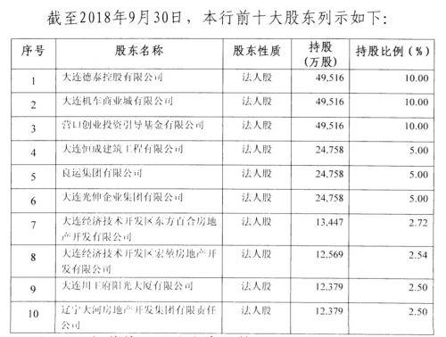 每经小编注意到,大连农商银行披露的信息还显示,该行股东持股较为分散,现有股东5382户,其中法人股东104户,前三大股东分别为大连德泰控股有限公司、大连机车商业城有限公司、营口创业投资引导基金有限公司,分别持有4.95亿元,占总股本比例为10%。