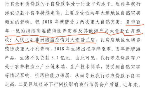 上述文件显示,大连农商行在去年的遭遇可谓是“流年不利”:先是夏天高温让海参热死,接着又是入秋后生猪遭遇猪瘟,这些事件都让该银行不良贷款率大幅提高。