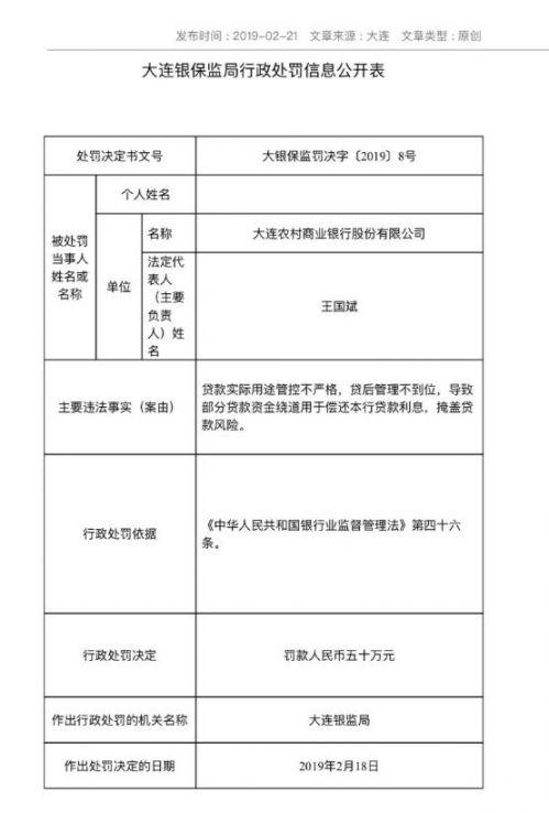 值得一提的是,2月21日,大连银保监局连开5张罚单,其中大连农商行就因贷款管理问题领到4张。比如其中一张罚单就显示,大连农商银行存在贷款实际用途管控不严格,贷后管理不到位,导致部分贷款资金绕道用于偿还本行贷款利息,掩盖贷款风险的违法行为,该行也因此被罚款50万元。