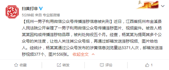 新京报快讯 据全国“扫黄打非”办公室官方微博消息,近日,江西省抚州市金溪县人民法院公开审理了一男子利用微信公众号传播淫秽图片、视频案件。被告人杨某某因构成传播淫秽物品罪,被判处拘役五个月。