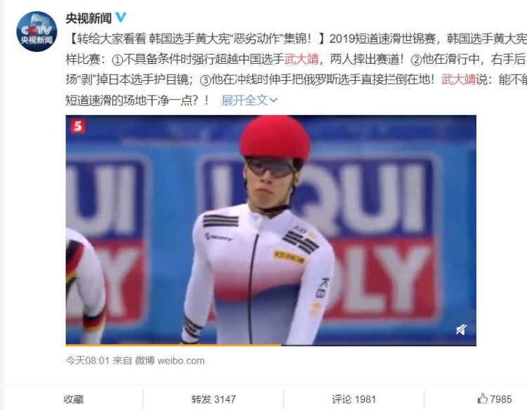 据了解,2019短道速滑世锦赛赛,韩国选手黄大宪多次出现争议动作:恶意阻挡、剥护目镜……包括武大靖在内多名选手受其影响。而他也是韩国短道“犯规王”,多次在国际大赛上演犯规戏码,还曾在平昌冬奥拉扯自己的队友,只为争夺晋级名额。