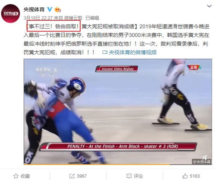 在昨晚结束的男子3000米决赛中,韩国选手黄大宪在最后冲线时刻伸手把俄罗斯选手直接拦倒在地!这一次,裁判观看录像后,判罚黄大宪犯规,成绩取消!
