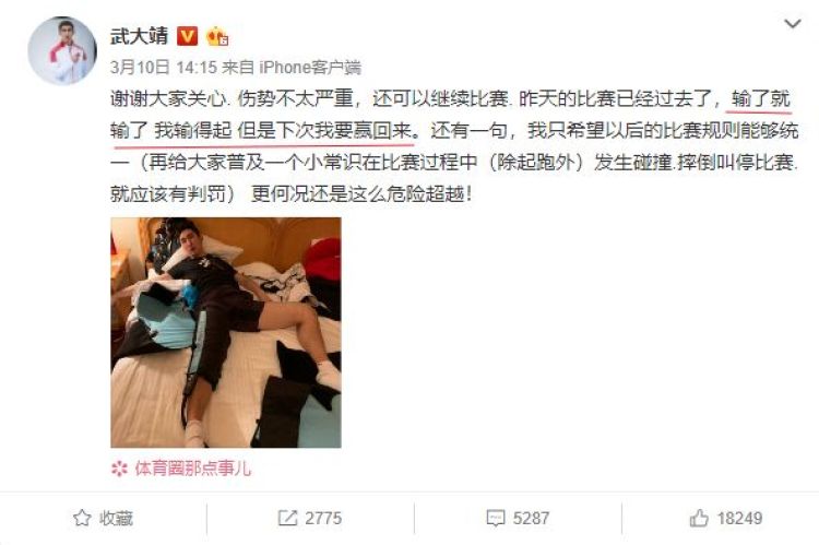 10日晚,武大靖向关注他的网友报平安,他还说:昨天的比赛已经过去了,输了就输了,我输得起,但是下次我要赢回来。