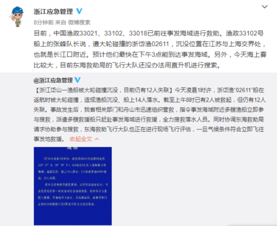 12日下午3时左右,浙江省应急管理厅在其官方微博发布,目前,中国渔政33021、33102、33018已前往事发海域进行救助。渔政33102号船上的张峰队长说,遭大轮碰撞的浙岱渔02611,沉没位置在江苏与上海交界处,也就是长江口附近。预计他们最快在下午3点能到达事发海域。另外,今天海上雾比较大,目前东海救助局的飞行大队还没办法用直升机进行搜索。