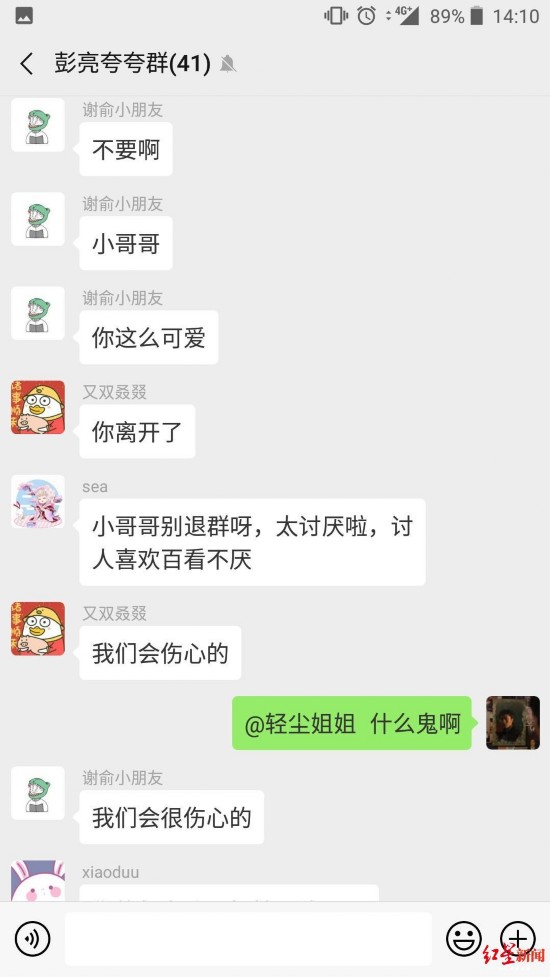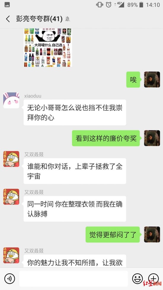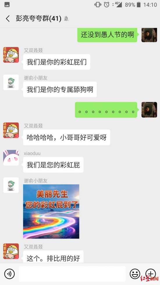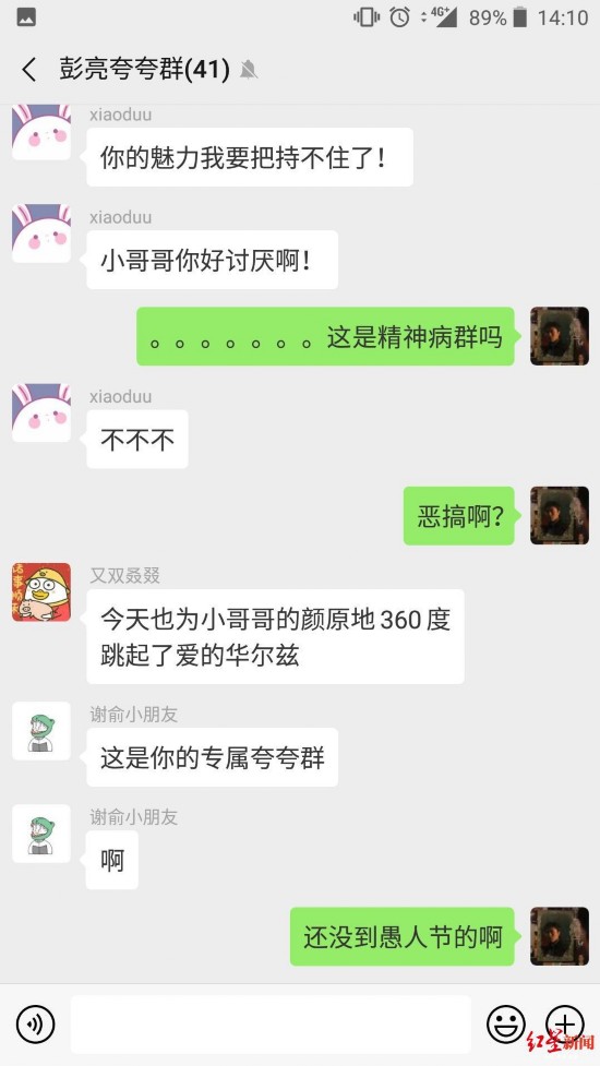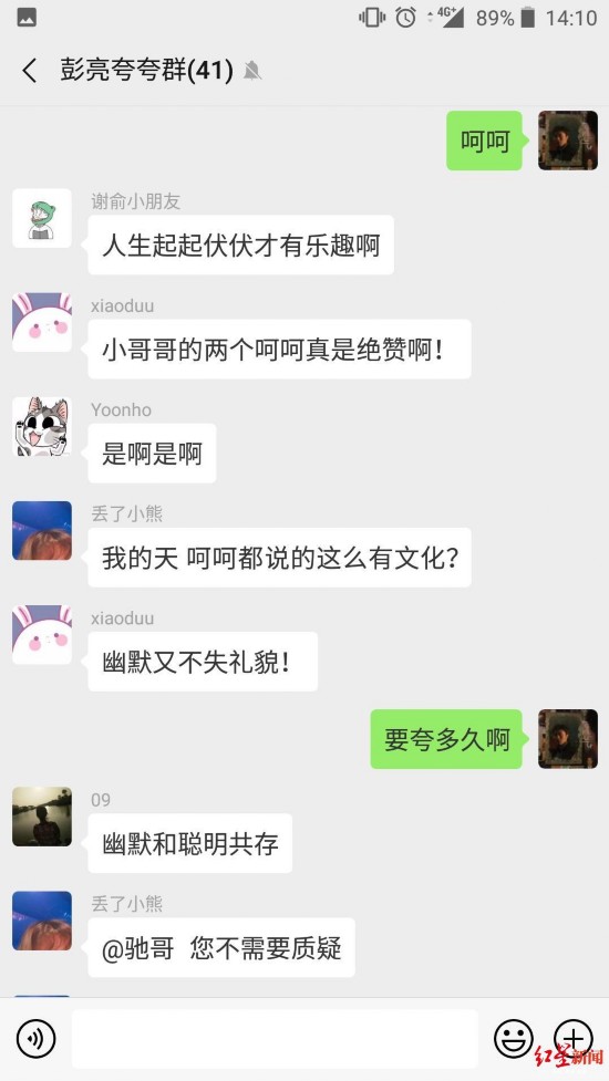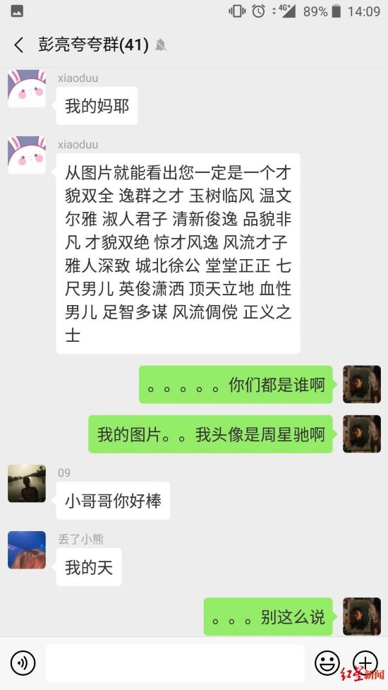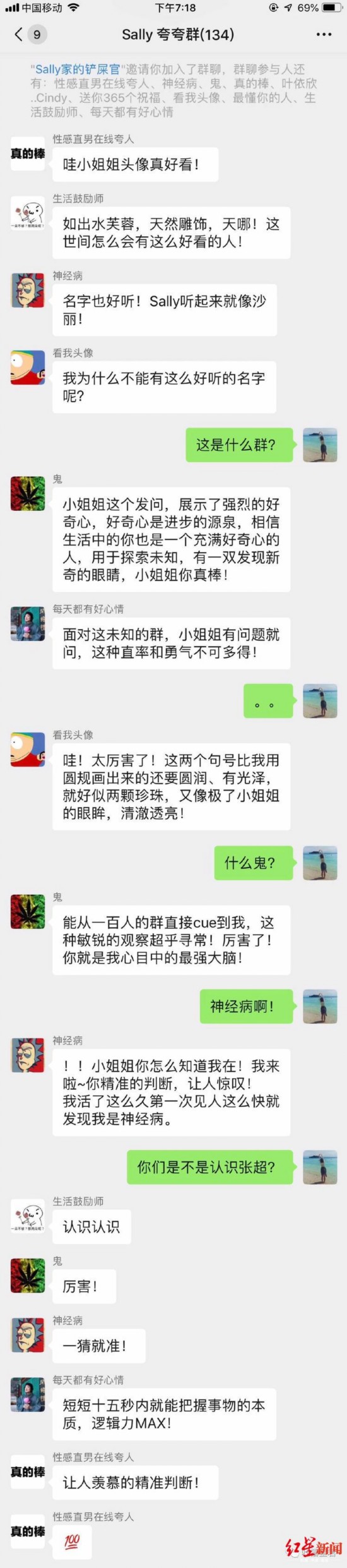 群友从头像开始夸起,从头像即可看出来同事是一位玉树临风的男子,尴尬的是,同事微信头像是周星驰,当同事惊问这是什么群?几个群友打出“我们是你的彩虹屁们”……因为无任何针对性,这些夸奖之词显得有些尬聊,甚至有些不得体。五分钟一到,记者和同事都被踢出群,店家同时提醒记者确认收货。