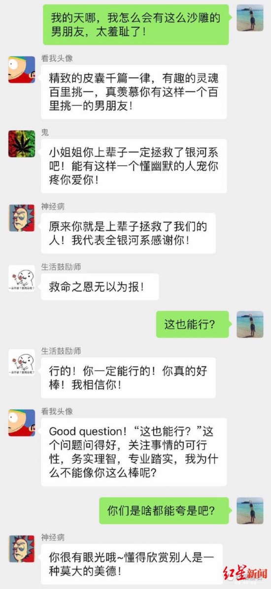 一位女网友在网上爆料,三八妇女节那天,男朋友说要给自己一个惊喜,结果把她拉进一个百人群,群友集体夸了她三分钟。“他说是某宝上买的夸夸群,这种沙雕男朋友还留着么”。