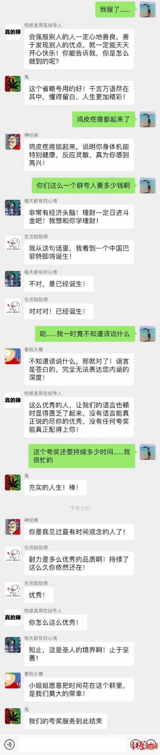 下单后,店家提供了微信号,记者加了微信,店家要了同事的名字,然后将记者拉入一个41人的群,记者再将同事拉入群。“五分钟要踢群的那种”,待同事进群后,夸人便开始了。