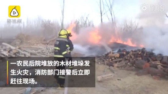 3月10日,新疆喀什地区莎车县一居民家后院堆放的木材堆垛发生火灾,消防员接警赶到现场迅速将火扑灭。