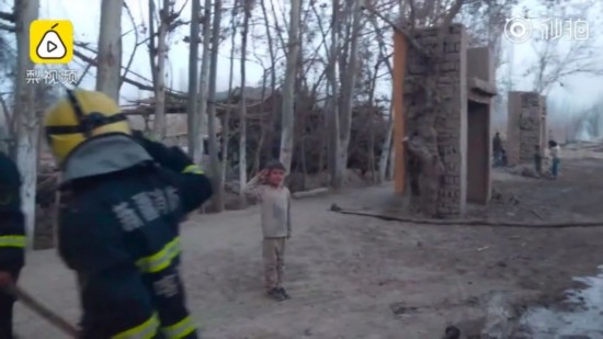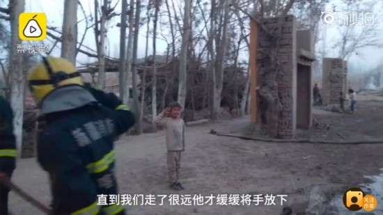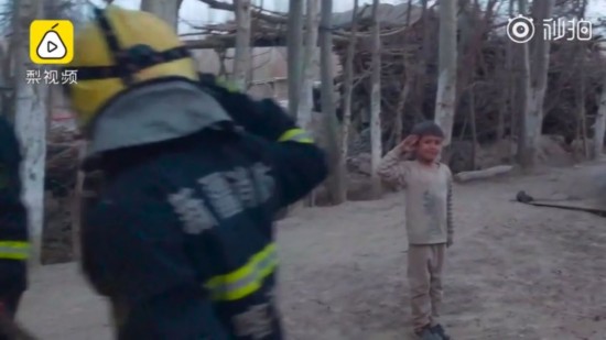 正当消防员收拾器材准备离开时,一名5岁小男孩突然向正在收整水带的消防员敬礼。