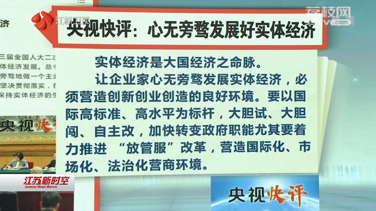 央视快评说:实体经济是大国经济之命脉。让企业家心无旁骛发展实体经济,必须营造创新创业创造的良好环境。要以国际高标准、高水平为标杆,大胆试、大胆闯、自主改,加快转变政府职能尤其要着力推进 "放管服"改革,营造国际化、市场化、法治化营商环境。