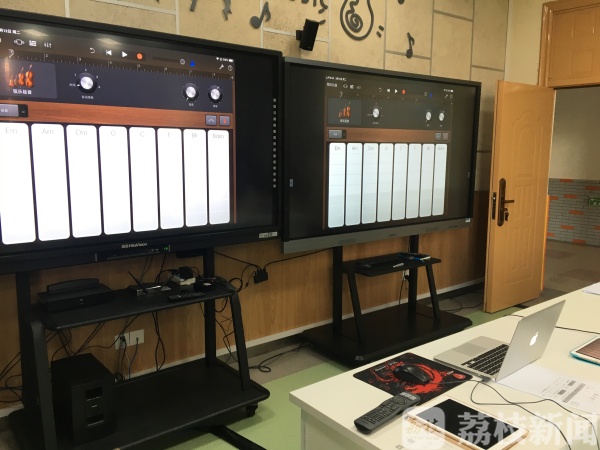 南京市教育技术装备中心技术科科长宋涛介绍,两台内置电脑的显示器,一套网络交换设备(含无线路由器和数据同步充电柜),一套音响,一个MIDI键盘,一台教学用电脑,再加上学生手持移动设备,一个数字音乐教室就基本成型了。原先的音乐课都是一个老师对学生进行集体的音乐传导,现在变成了每个孩子都有音乐创作的主动性,他们可以个性化地去聆听,每个人听不同的节奏和不同的音乐,他们可以体会到同一个音乐不同的感受,也可以把音乐中加上自己的元素,去充分地感知创作。