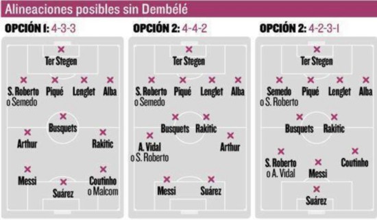 如果不上库蒂尼奥,那巴尔韦德可以选择改打442或者保持打433。打433最简单的方式就是让马尔科姆取代登贝莱,马尔科姆虽然本赛季几乎是一队中出场时间最少的球员,但总是有关键表现,比如欧冠小组赛对国际米兰的比赛中,他只有10分钟的出场时间就打进了扳平进球。在国王杯半决赛对皇马的首回合比赛中,他打进了关键的扳平进球。这是一个比库蒂尼奥有更多关键发挥的球员。