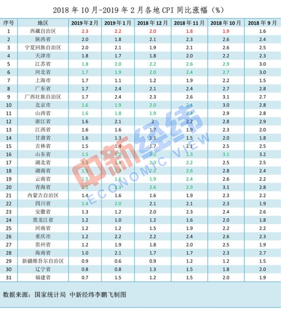 其中,西藏2月份CPI同比涨幅领涨全国,已连续3个月涨幅超过2%。2月份CPI同比涨幅最低的是福建省,仅为0.7%,较1月大幅回落0.8个百分点。此外,新疆连续6个月位列涨幅最低的前三名。