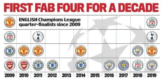 2008-09赛季之后,再次有4家英超俱乐部会师欧冠8强。在热刺、曼联和曼城先后晋级之后,利物浦在周三晚上的安联球场搭上了8强末班车,他们在3比1战胜拜仁慕尼黑之后,成为了本赛季第四支晋级欧冠1/4决赛的英格兰球队。