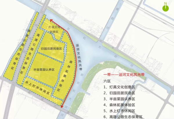 一带是指运河文化风光带,六区包含灯具文化创意区、归园田居民宿区、半亩菜田认养区、森林拓展体验区、水上灯市休闲区和高速公路生态保育区。