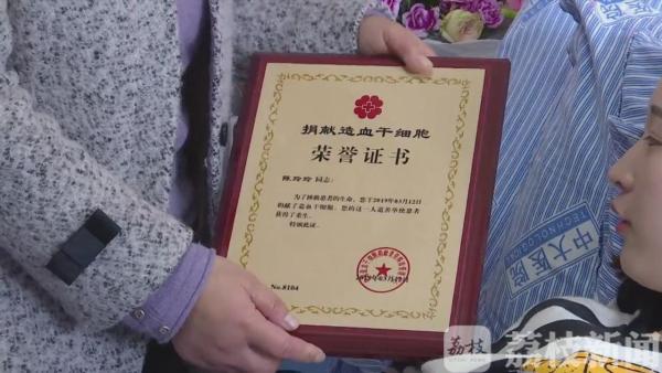 8点34分,第一批造血干细胞输送到袋内。 陈玲玲的经管医生带着江苏省红十字会的负责人也来到现场,向她送上捐献造血干细胞的荣誉证书以及奖牌。