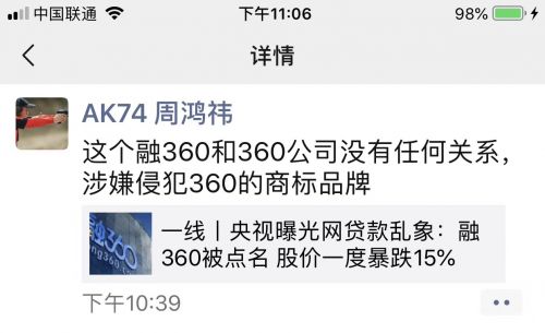 央视3·15晚会曝光“714高炮”超利贷,融360被点名。融360盘中股价一度大跌近15%。据新浪科技报道,360科技有限公司董事长周鸿祎疑在其朋友圈回应称:融360和360公司没有任何关系,涉嫌侵犯360的商标品牌。