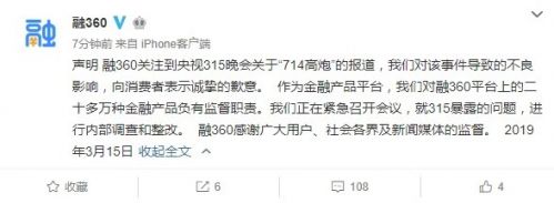 据悉,融360就被央视315曝光一事发表声明回应称,关注到央视315晚会关于“714高炮”的报道,我们对该事件导致的不良影响,向消费者表示诚挚的歉意。