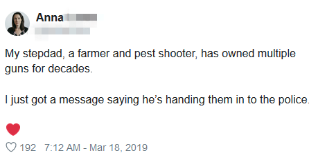 还有网友称“我的继父是一名农民,他因为工作的原因持枪几十年了,但是我给他发短信,让他把枪支上交给警察”。