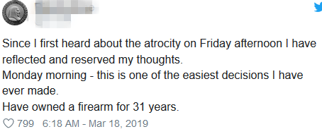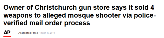 有外媒曝出,这次枪击案的嫌犯之一,澳大利亚籍的布伦顿·塔兰特不仅拥有持枪执照而且合法持有5把枪,包括2把半自动枪支、2支手枪以及1把连珠式步枪。美联社18日报道称,当地枪支商店老板表示,自己曾卖出过4把和清真寺惨案有关的枪支,但都经过了正规程序。事件使得新西兰当局开始反思本国的枪支政策。