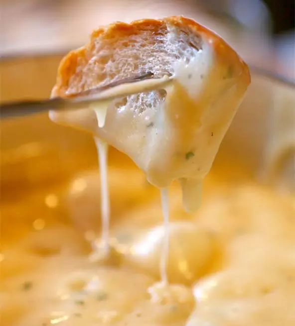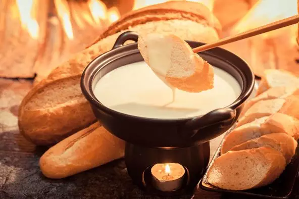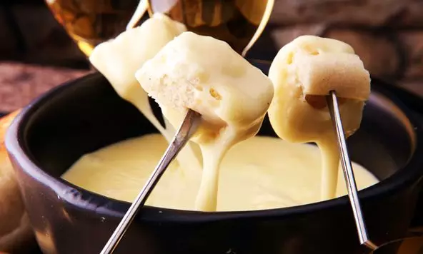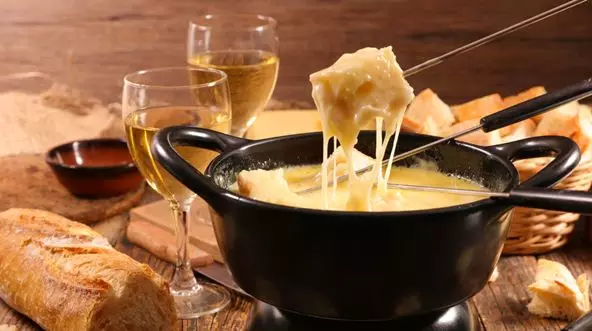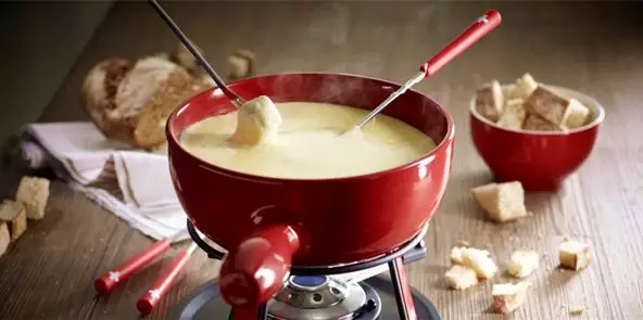 瑞士的冬季漫长而寒冷,为了抵御严寒,位于瑞士法语圈的西部山民,因地制宜得使用他们为之骄傲的各式奶酪,创造出了一款别致的冬日美食,它就是奶酪火锅(Fondue au fromage),“Fondue”一词在法语里有着“融化”的含义。