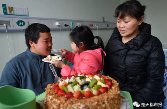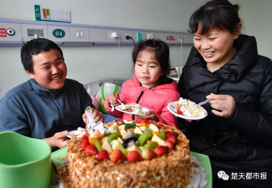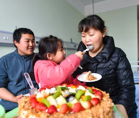 然后周龙坐在病床边,一脸幸福地看着妹妹用小勺一口一口地喂妈妈吃蛋糕,“妈妈,好吃吗?”“好吃。”