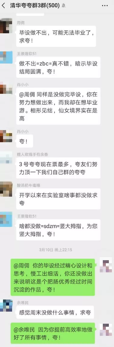 “毕设(毕业设计)做不出来,可能无法毕业了,求夸!”一位同学在群里表达求赞美的诉求。几分钟内,就有无数溢美之词出现。