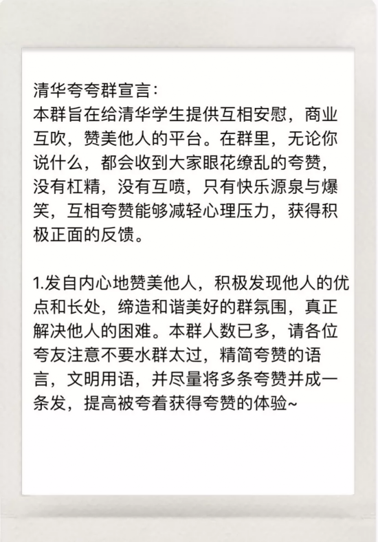 当然,加入“夸夸群”也有“规矩”。在“清华夸夸群”的群公告里,就有这样的批示——