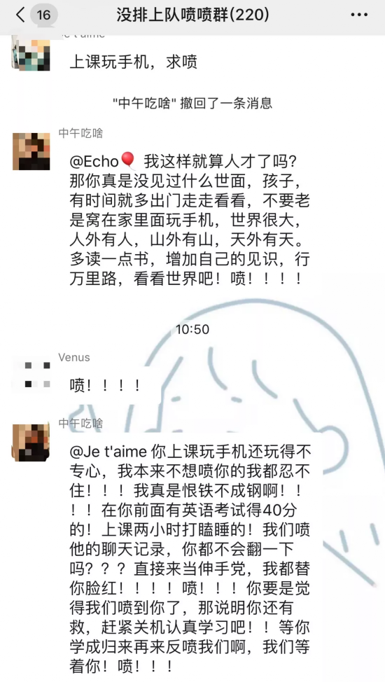 在一个名为“没排上队喷喷群”里,不少学生在其中吐槽自己没做好的事情,希望在骂声中“痛改前非”——