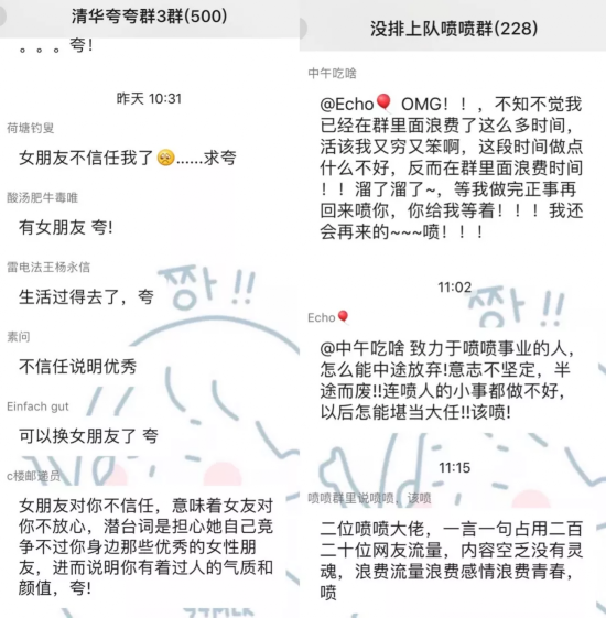 图中,左为“夸夸群”右为“喷喷群” 图片来源:微信聊天截图