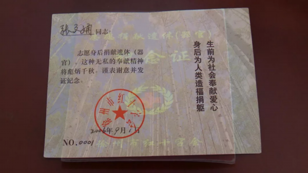 2006年9月1日,老人签署了遗体捐献志愿书,也是当年第一位签订全遗体捐赠的志愿者。遗体捐赠证书编号为0001。