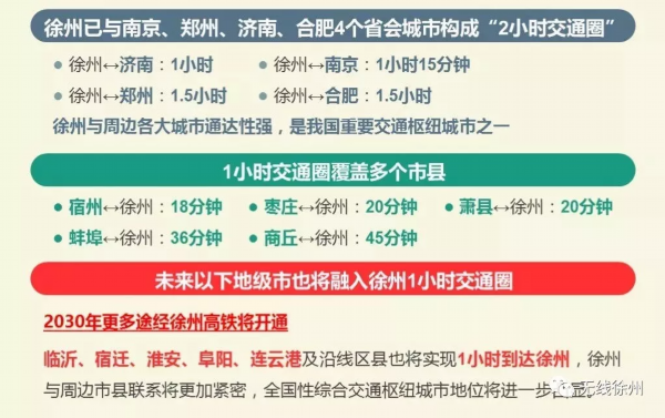 根据这份报告,徐州目前1小时内可通达宿州、枣庄、萧县、蚌埠、商丘等5个市县。随着国家“八纵八横”高铁网络的进一步延伸,未来将有更多地级市融入到徐州高铁1-2小时交通圈。