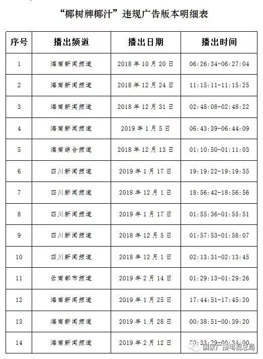 为严肃播出纪律,切实维护广大人民群众合法权益,根据相关法律法规规定,总局决定,自即日起,各级广播电视播出机构立即停止播出相关版本的“椰树牌椰汁”“力补金秋胶囊”和“强身牌四子填精胶囊”广告,并举一反三,全面清查所有在播和拟播广告,严把导向关,凡存在类似违规问题的,一律禁止播出,坚决杜绝此类违规问题。