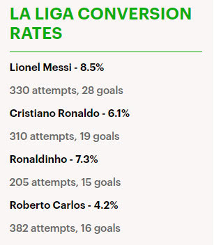 另一位巴萨传奇小罗205次尝试打进15球,转化率是7.3%,而以大力任意球知名的罗伯托-卡洛斯转化率仅有4.2%,他踢了382脚仅收获16球。