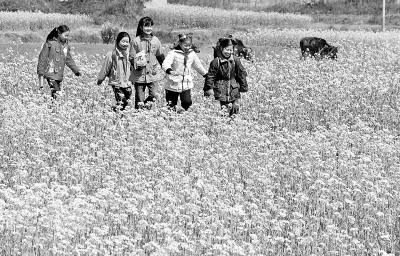 江西省鄱阳县,一层层油菜花传递着春天的气息,乡村小学学生快乐地奔跑在上学途中。光明图片/视觉中国